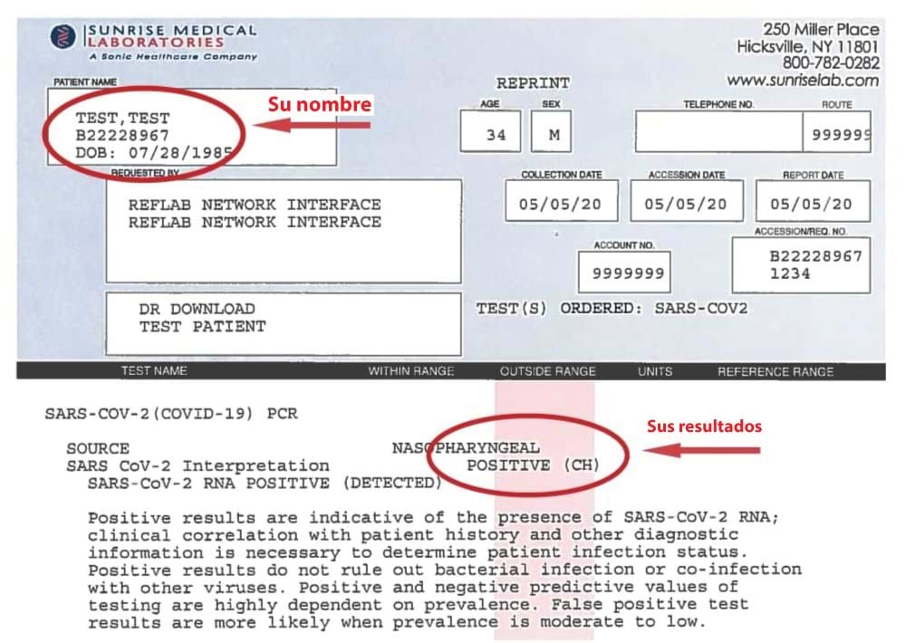 Resultados positivos: Usted a dado positivo para SARS-CoV-2, el virus que causa COVID-19. O bien se ha detectado el objetivo 1 solo o bien se han detectado los objetivos 1 y 2 (nuestros laboratorios asociados no informan específicamente si usted dio positivo solamente para el objetivo 1 o para los objetivos 1 y 2, ya que no es relevante, cualquier escenario es positivo). Es probable que esté en período de contagio activo y deberá hacer una cuarentena en su casa (dormir solo en la cama, si es posible usar su propio baño, limpiar las superficies y usar una mascarilla cuando esté en una misma habitación con otras personas). Tenga en cuenta que un pequeño porcentaje de pacientes con infección activa pueden ser completamente asintomáticos. CityMD sugiere la última recomendación de los CDC para volver al trabajo con la regla de 10/3. Si no tuvo síntomas al momento del hisopado nasal para la PCR, puede volver a trabajar en 10 días (siempre y cuando no haya tenido fiebre 3 días antes de volver al trabajo). Si está asintomático y tiene un resultado positivo, es probable que todavía pueda contagiar a otras personas. Un resultado positivo para la PCR no brinda ninguna información sobre la posible inmunidad. Hágase inmediatamente una reevaluación si empeoran síntomas tales como falta de aire o mareos.